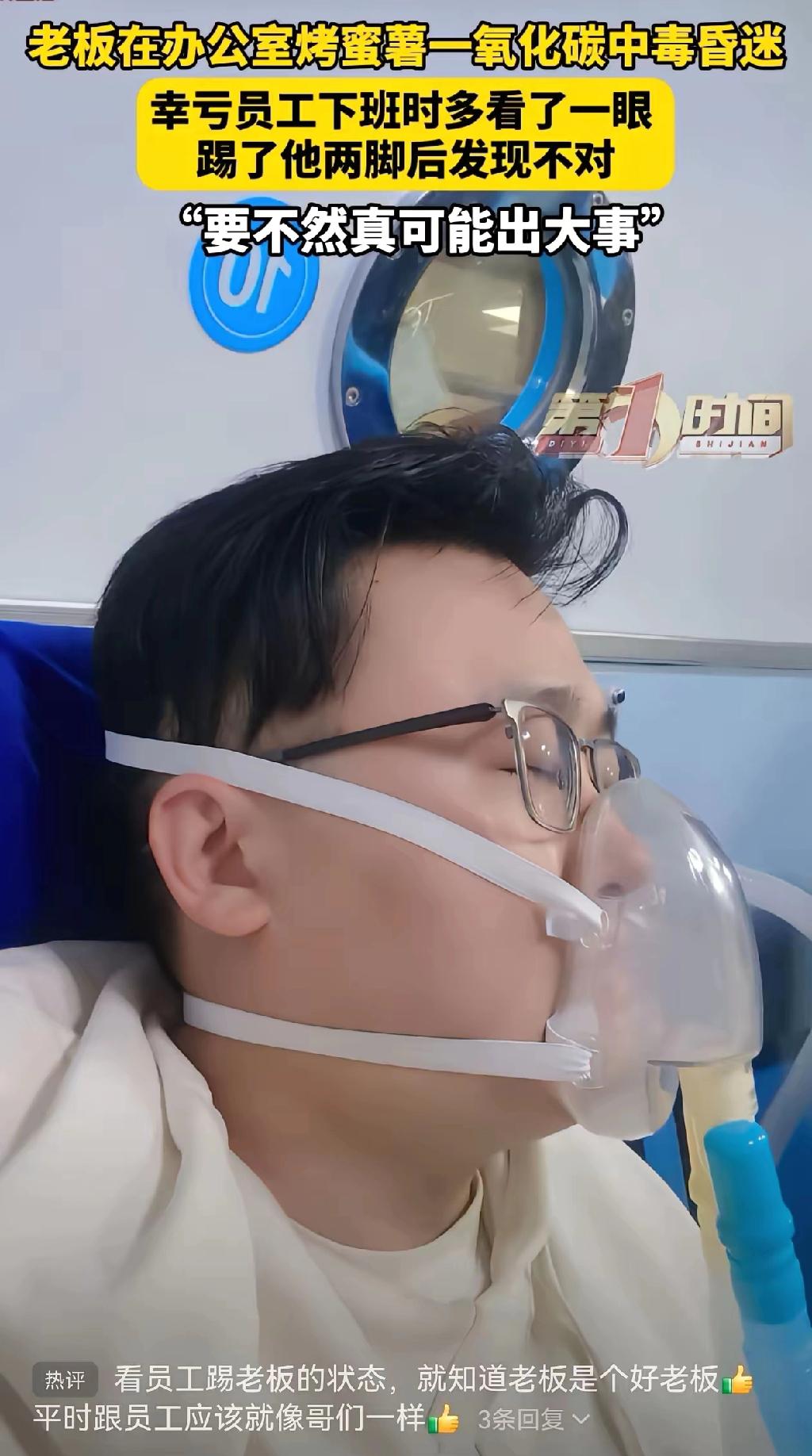 多看一眼救人一命啊!12月9日采访披露,山东青州一老板在办公室烤蜜薯,下班时间了还躺在沙发上,感觉睡着了。 最后离开的员工收拾东西时,瞥见老板躺在沙发上,耳机挂在耳边。 员工喊了两声没回应,本来已经拉了门,又折回来拍了拍老板,发现对方身体发烫,意识模糊。 办公室门窗紧闭,墙角的小炭炉还没完全熄灭,烤蜜薯的焦味混着闷味弥漫在屋里。 员工立刻打120,又喊来隔壁公司同事帮忙。 急救医生赶到后检测,老板碳氧血红蛋白数值严重超标,确诊一氧化碳中毒,再晚半小时就有生命危险。 封闭空间用炭火烤东西,极易引发一氧化碳中毒,冬天这类事故频发。 很多人抱有侥幸心理,觉得“就用一会儿没事”,却忽略了一氧化碳无色无味,悄无声息就能让人昏迷。 这位员工的“多看一眼”,救了老板一条命。 工作生活中,多留意身边异常,可能就是别人的生机。 你身边有没有遇到过类似的危险情况?冬天用炭火、燃气设备时,你会注意通风吗?欢迎在评论区留言。