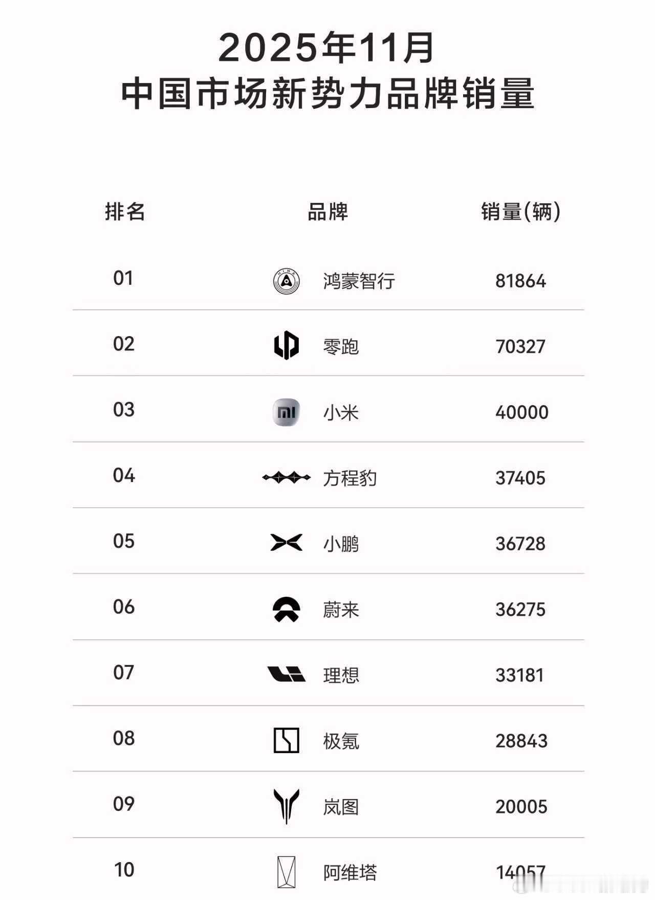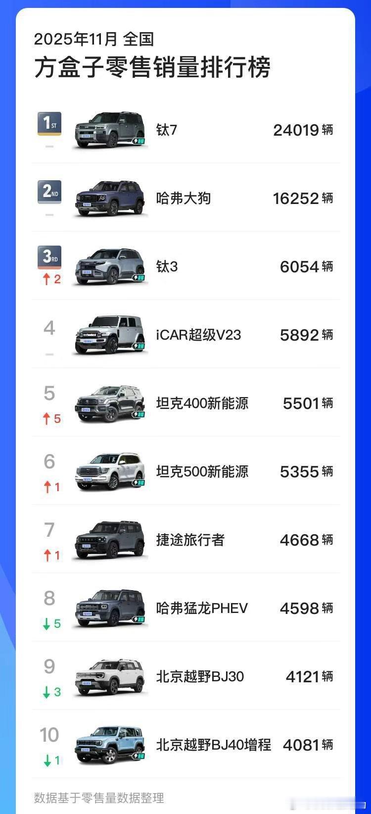 方程豹汽车11月猛销37405台,同比暴涨339%,超过蔚小理跃居新势力品牌销量TOP4,品牌势能全面爆发。现象级爆款车型 钛7:以24019台的单月销量,再次霸榜混动SUV销量冠军、方盒子车型销量冠军。“科技潮品SUV”钛3,11月销售6054台,拿下纯电方盒子销量冠军、跻身方盒子车型销量TOP3。“越野新王”豹5,11月销售5569台,登顶11月新能源硬派越野批发销量冠军、2025年1-11月硬派越野累计销量冠军。“稀缺旗舰”豹8,11月销售1763台,持续领跑40万级高端SUV市场。