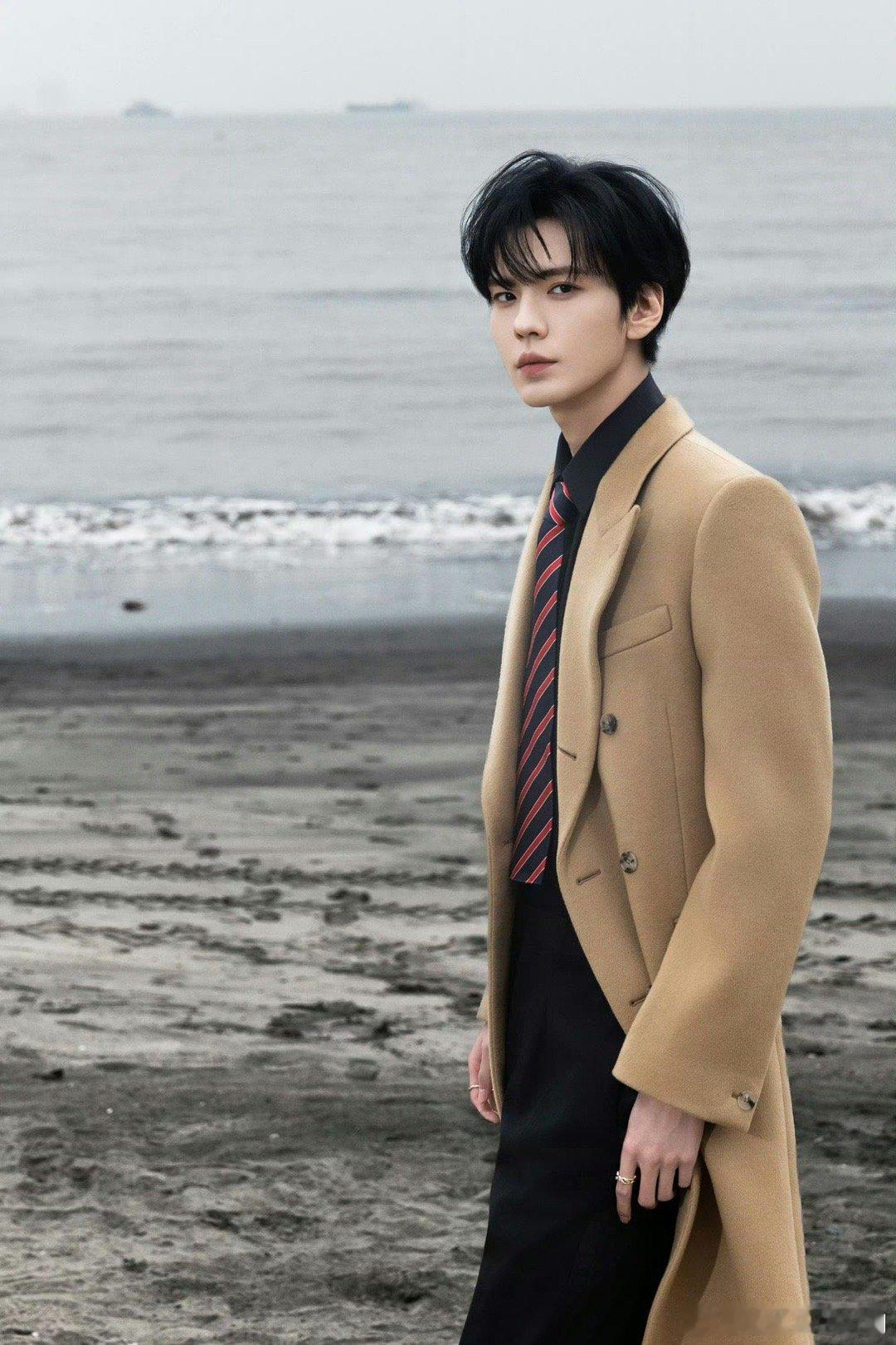 毕雯珺帅得我有心事了 浅棕大衣裹着他的模特身材,黑衬衫条纹领带细节满分,海边背景