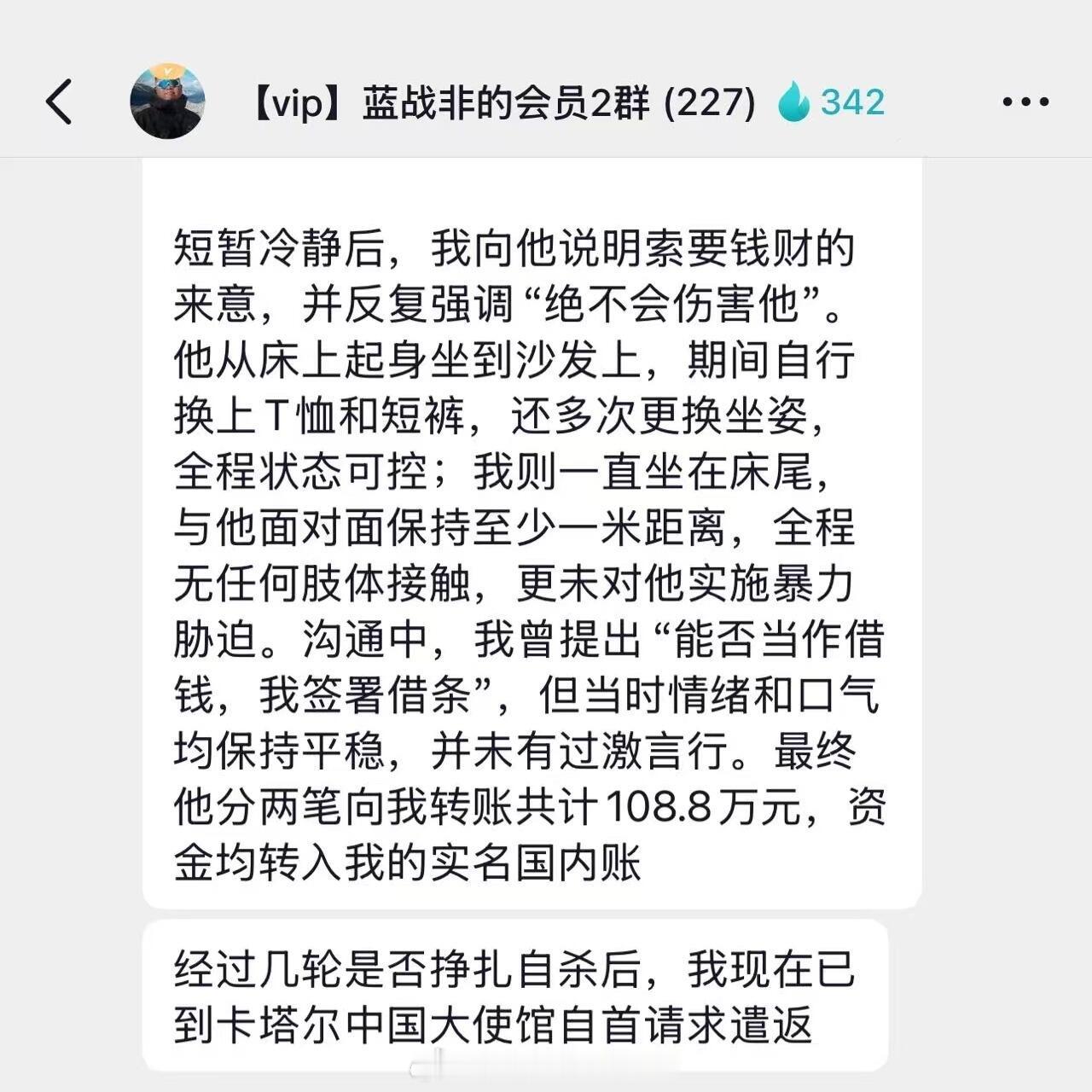 绑架蓝战非的那个人,主动出来自首了。他说炒股和消费导致缺钱。绑架时,没有“多人围堵”和“驾刀脱衣”,而是平静的找他要钱,还说可以打欠条,最后拿了108万。现在自首