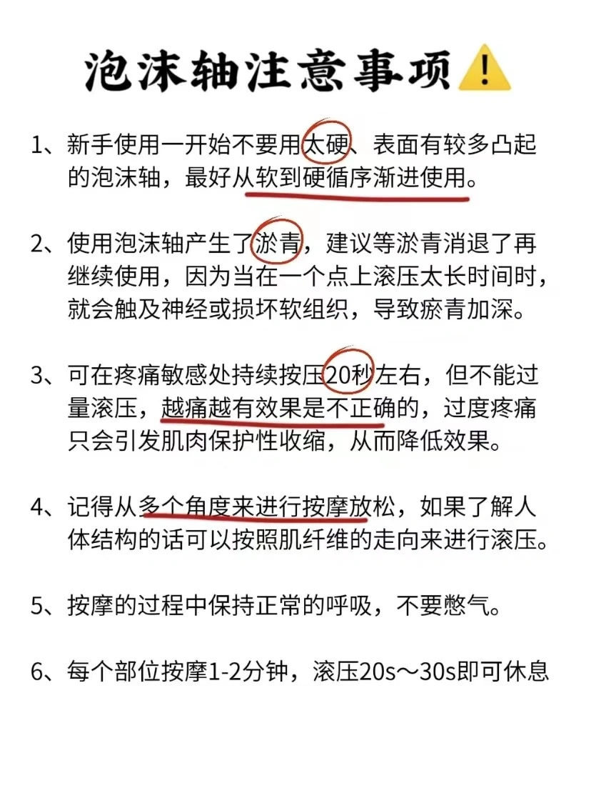建议新手选择偏软一点的泡沫轴,或者凸点不多的,等适应一段时间后觉得痛点不强的时候再用较硬的泡沫轴,进行深层按摩