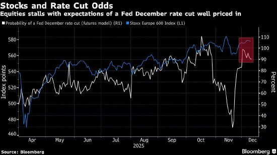 欧洲股市仍在接近11月份创下的纪录高位附近交易,不过在全球央行货币宽松步伐引发担忧之际,动能有所减弱。交易员对美联储周三几乎板上钉钉的降息之后未来的政策路径感到愈发不安。