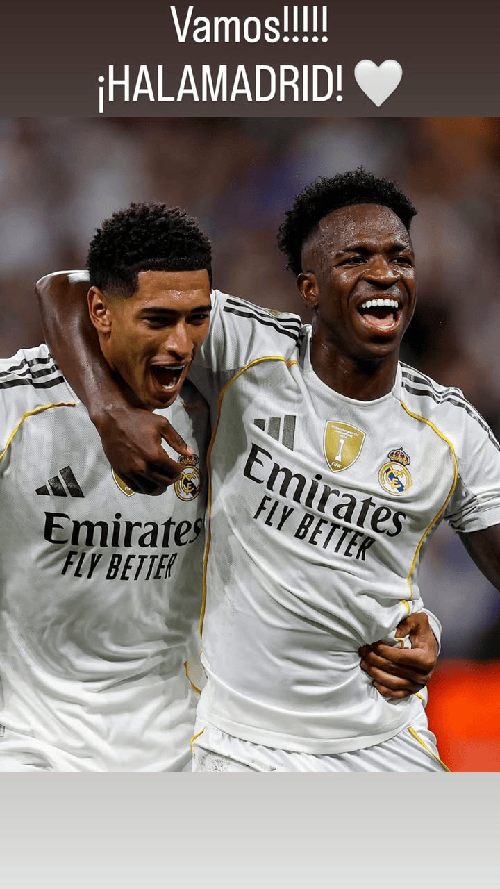 赛前,皇马前锋维尼修斯更新社媒,发布了一张与贝林厄姆比赛中的合照并附文:“前进,皇家马德里!”