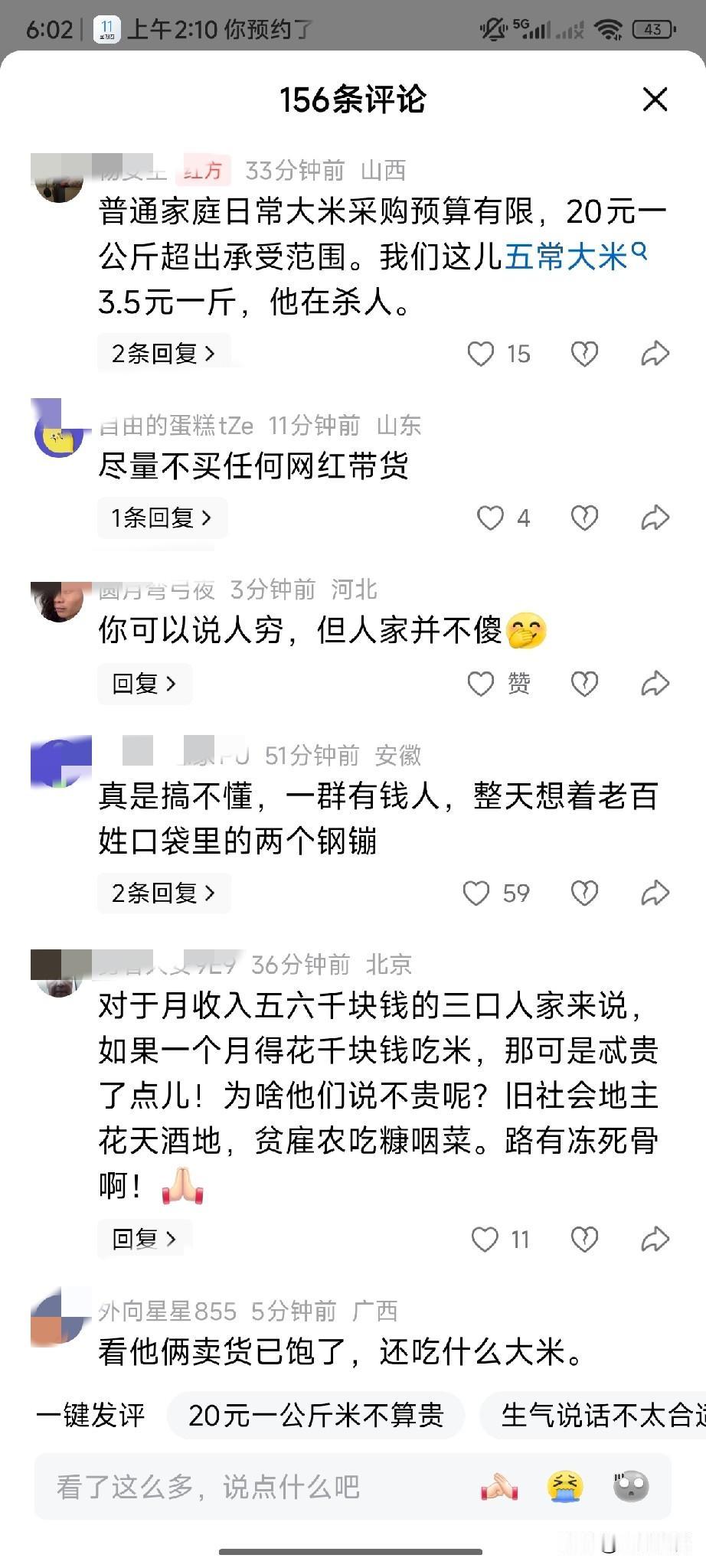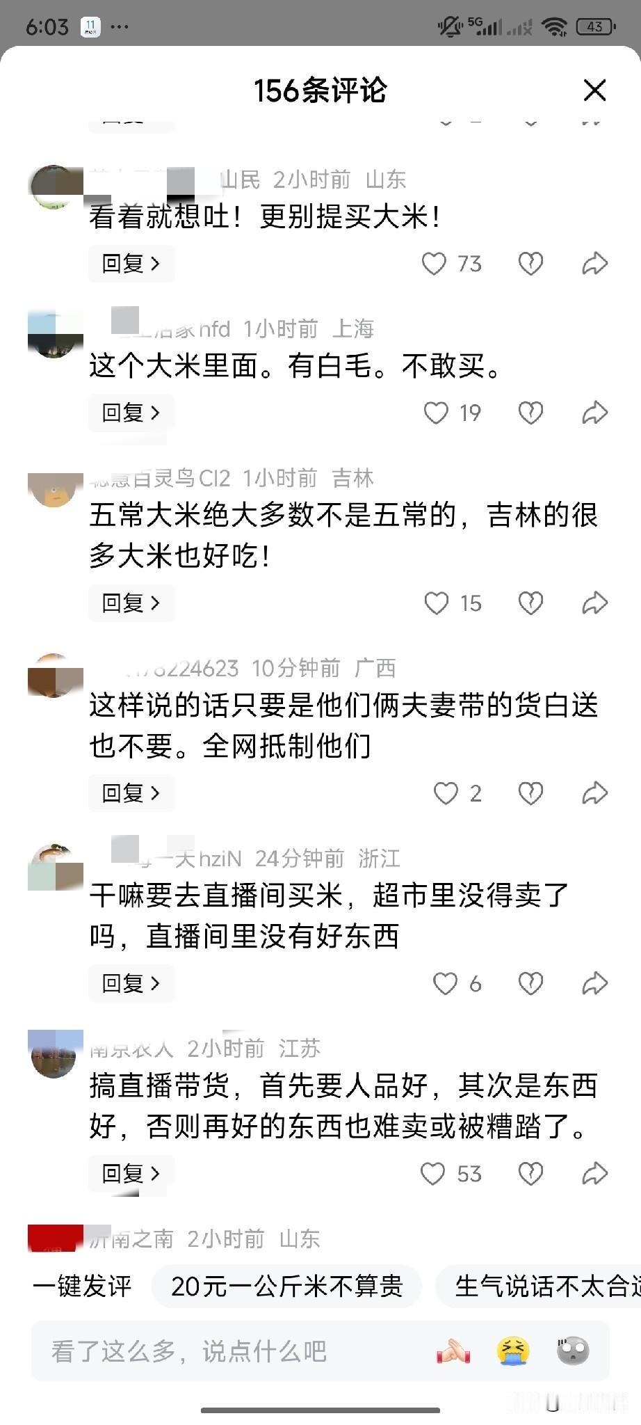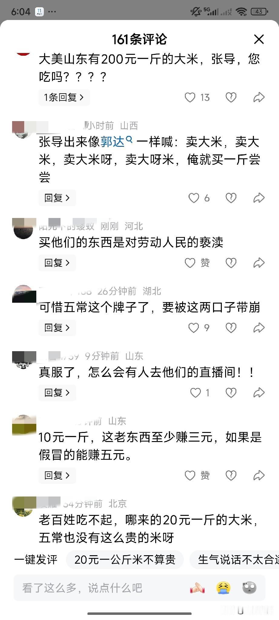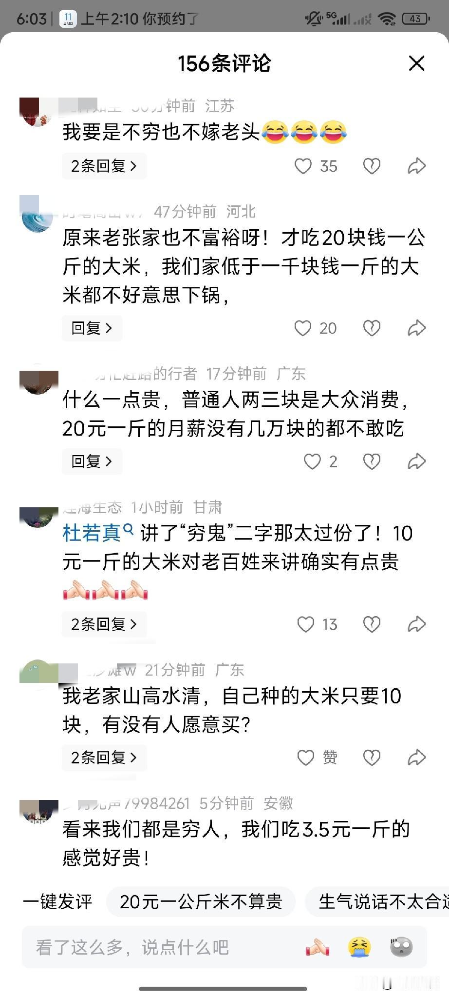 哪个五常大米要20元一公斤?天天晒富豪生活,天天还想着割别人家韭菜。 张纪中夫妇这一举动,无疑是激起了民愤! 据这位网民说张纪中夫妇直播卖五常大米,每公斤20元,下单的人很少,张纪中说:20元一公斤的大米还贵吗?我天天吃这种大米,杜星霖生气地说:真是一帮穷鬼。 评论区沦陷了!要我说,杜星霖也是出生在一个普通家庭,就像她自己说的穷鬼家庭,只不过靠着嫁人逆天改命,但是有哪个人会羡慕她呢?给我也不想嫁老头,再有钱也不嫁,当然每个人的选择不一样,所以说谁也别说谁。 如果我女儿像杜星霖一样找个爷爷,我肯定不会认,管他有没有钱,丢人现眼。 希望网民们看到他们再在直播间公然羞辱民众,都立马举报,希望平台封了他们。