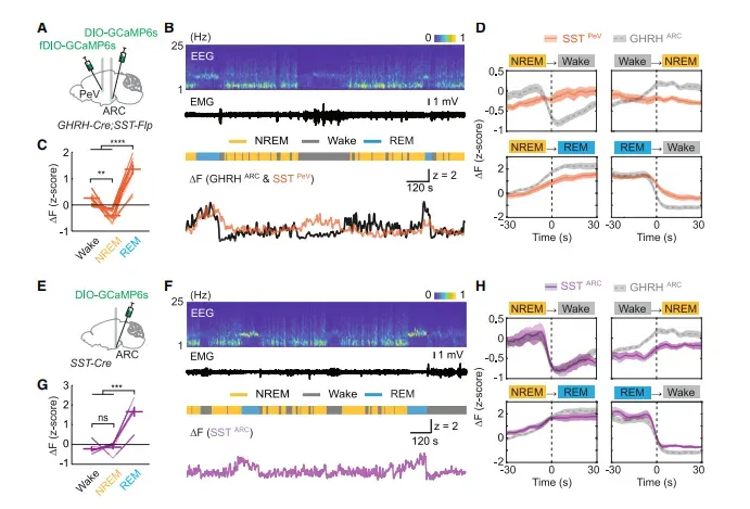 接着,双光度计同时盯住ARC-GHRH与PeV-SST:REM期二者钙信号同时冲高,峰-谷差值ΔF/F≈2.5(图2C,图3C);而NREM期GHRH小幅上升(ΔF/F≈0.8),PeV-SST却明显回落,呈现“油门略踩、刹车松脚”的相对优势(图3D)。若用20 Hz光强行激活PeV-SST,GH升幅被瞬间压缩60%;相反,化学遗传抑制ARC-SST 15 min后,GH升高3倍。两群SST神经元分工明确:ARC-SST以GABA+SST直接抑制邻近GHRH胞体;PeV-SST则投射至正中隆起,远程拮抗垂体somatotroph。