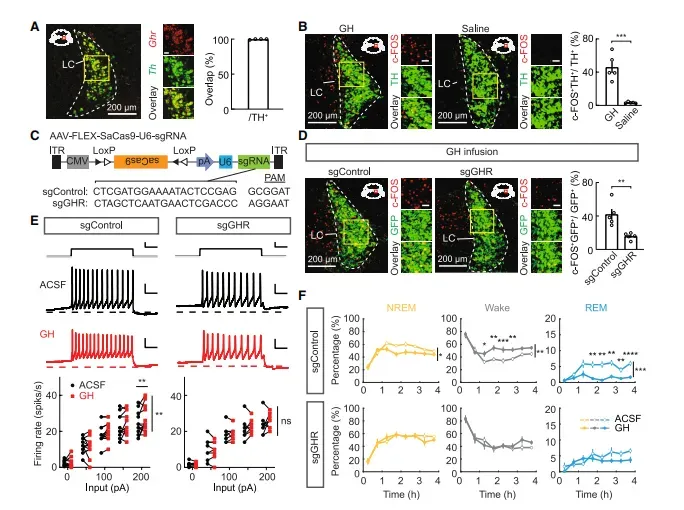更出人意料的是“GH反过来管睡眠”。静脉注射1 µg/kg GH,2 h后LC去甲肾上腺素能神经元c-FOS阳性率由10%飙至60%(图4B);脑室灌注40 µg GH,小鼠觉醒时间增20%,NREM减15%(图4F)。若事先在LC敲除GHR,GH促觉醒效应几乎归零(p=0.74)。膜片钳显示,GH使LC神经元电流诱发放电斜率增43%,而GHR敲除后该增益消失(图4E)。一条“GH↑→LC兴奋→觉醒↑→GH↓”的负反馈因此闭合,为“熬夜削弱GH”提供了自我放大的生物学脚注。