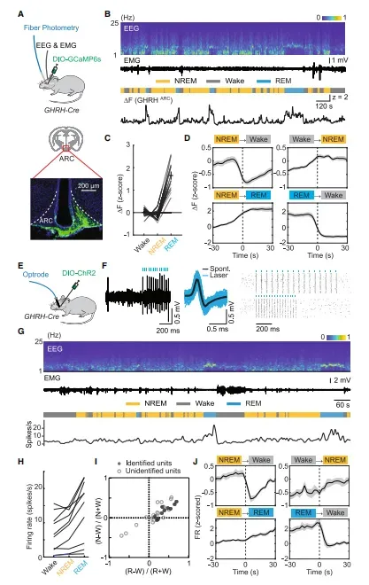 2025年9月,Cell在线发表了一篇题为“Neuroendocrine circuit for sleep-dependent growth hormone release”的文章,用光遗传-化学遗传-钙成像“三件套”把整条回路搬到小鼠活体:原来弓状核(ARC)GHRH神经元是“油门”,ARC与PeV(室周核)两群SST神经元分别踩“行为刹车”和“外周刹车”,而GH反过来通过蓝斑核(LC)去甲肾上腺素能神经元把睡眠扳回觉醒——一条负反馈环就此闭合。