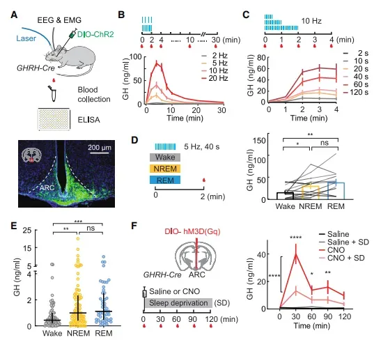 主要干预包括:不同频率(2–20 Hz)与时长(2–120 s)的光刺激GHRH轴突;化学遗传激活/抑制SST神经元并联合睡眠剥夺;CRISPR敲低LC神经元GH受体(GHR)。主要评价指标为尾血GH浓度(高敏ELISA,每2.5 µl),同步记录钙信号(GCaMP6s光纤光度法)与单位放电(optrode)。次要指标包括脑电图谱功率、觉醒-睡眠时相分布及c-FOS表达。所有实验均在光照期完成,以排除昼夜节律干扰;每只鼠采血总量<25 µl,交叉设计使自身对照,样本量按配对t检验power≥0.8计算。