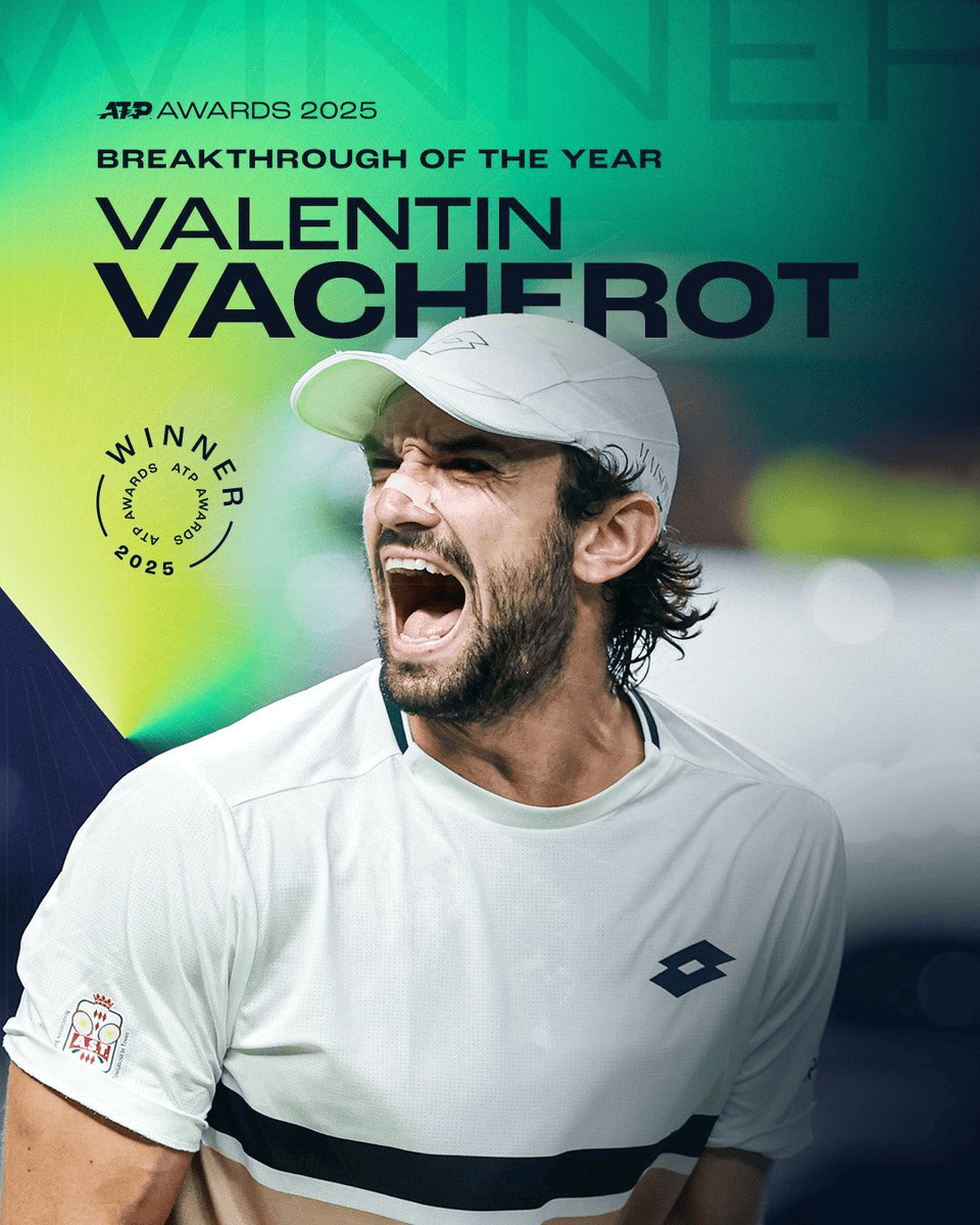 虎扑12月11日讯北京时间昨晚,ATP官方宣布摩纳哥球员瓦伦丁-瓦舍罗荣获2025年度突破球员奖。
