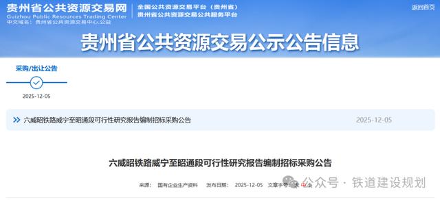 12月5日,六威昭铁路威宁至昭通段可行性研究报告编制招标采购公告在贵州省公共资源交易网发布,招标人为贵州铁路投资集团有限责任公司。