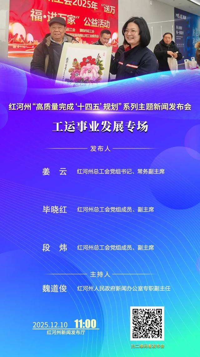 12月10日,红河州“高质量完成‘十四五’规划”系列主题新闻发布会工运事业发展专场在蒙自举行。发布会上,红河州总工会相关负责人介绍了红河州工运事业高质量完成“十四五”规划有关情况并回答记者提问。