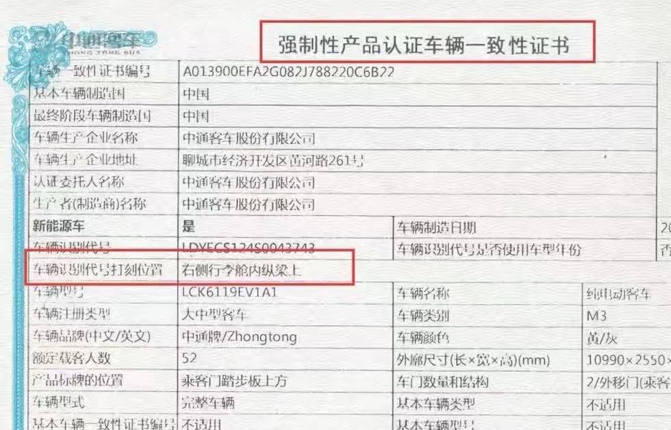 陕西红杉集团牛家梁集运有限公司(简称红杉集团)负责人孙先生日前向澎湃新闻(www.thepaper.cn)反映称,该公司从中通客车股份有限公司(简称中通客车)购买的一辆新能源大巴车,车辆识别代号打刻在车辆纵梁旁焊接的板材上,打刻位置不符合国家强制性标准要求,也与该车强制性产品认证车辆一致性证书所描述的位置不符。