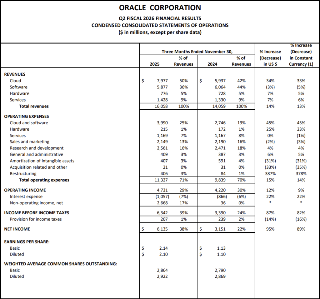 当地时间12月10日美股盘后,甲骨文公布截至11月30日的2026财年第二财季业绩,公司报告期间营收160.6亿美元,同比增长14%,低于市场预期的162.1亿美元;净利润为61.4亿美元,同比大增95%;非GAAP下调整后每股收益(EPS)为2.26美元,高于市场预期的1.64美元;运营利润率为42%。