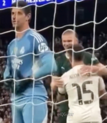 在一次角球防守中,居勒尔被派去盯防哈兰德,两人站在一起居勒尔矮了一个头,哈兰德也不禁露出笑容,抱抱居勒尔以示友好。