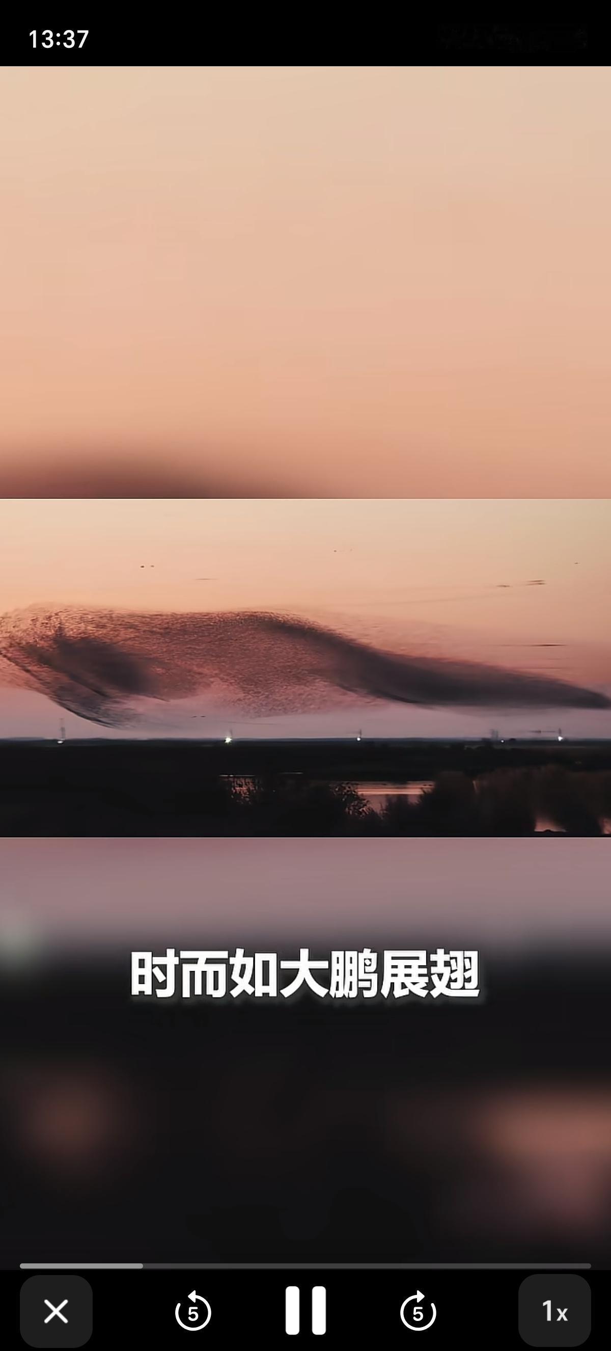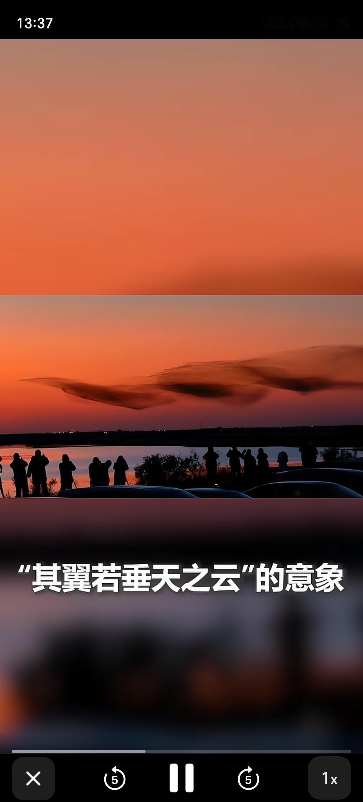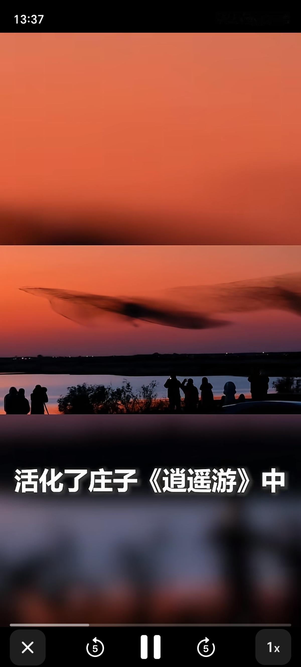 北冥有鱼,其名为鲲。鲲之大,不知其几千里也;化而为鸟,其名为鹏。鹏之背,不知其几千里也;怒而飞,其翼若垂天之云。是鸟也,海运则将徙于南冥。南冥者,天池也。 《齐谐》者,志怪者也。《谐》之言曰:“鹏之徙于南冥也,水击三千里,抟扶摇而上者九万里,去以六月息者也。”野马也,尘埃也,生物之以息相吹也。天之苍苍,其正色邪?其远而无所至极邪?其视下也,亦若是则已矣。 谁能想到,《逍遥游》里“北冥有鱼,其名为鲲”的奇幻想象,竟在山东东营黄河口变成了现实! 夕阳西垂,金辉铺满湿地滩涂,数十万只候鸟振翅而起,瞬间在天际间铺开一幅流动的画卷。你瞧,它们时而收拢羽翼,化作一条“巨鲲”,在橙红色的天幕下游弋,身形绵延数里,仿佛下一秒就要“水击三千里,抟扶摇而上者九万里”;时而又舒展翅膀,幻化成展翅的大鹏,羽翼相连,真应了那句“其翼若垂天之云”。单是花脸鸭,就有足足24万只扎堆在此,密密麻麻的鸟群掠过水面,翅膀扇动的声响汇成一片,与浪涛声交织,听得人心头阵阵澎湃。