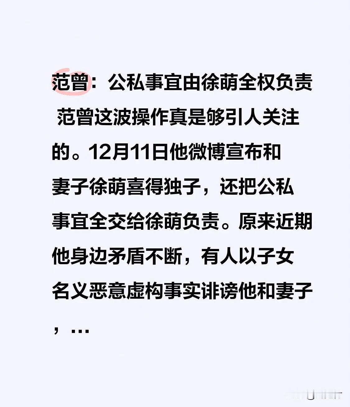 范曾:公私事宜由徐萌全权负责 范曾:公私事宜由徐萌全权负责 范曾这波操作着实引人关注。12月11日,他在微博宣布与妻子徐萌喜得独子,并将公私事宜全权交予徐萌负责。 原来,近期他身边矛盾不断,有人以子女名义恶意虚构事实,诽谤他和妻子,甚至危害一家三口安全、干扰生活。为此,他与范晓蕙、范仲达及其家属断绝关系,撤销相关委托授权。 此外,所有商业运营事务将通过12月2日刚成立的十翼范曾(北京)文化艺术有限公司办理,该公司法定代表人正是徐萌。 这一番操作过后,不知后续还会有何故事。徐懋 欧孝曾 徐萌 徐艺