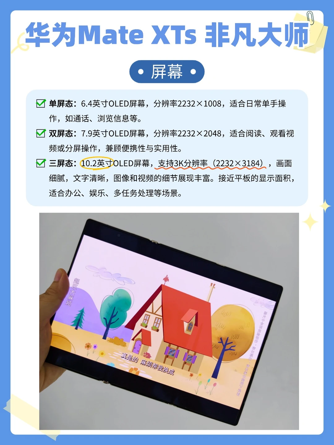 单屏6.4英寸,就像正常手机拿在手里一样,双屏摊开到7.9英寸,像本子,三屏展开是10.2英寸,是我见过最大的手机屏幕了,手机也能有平板画面的体验。屏幕分辨率高达3K,观影非常细腻沉浸。