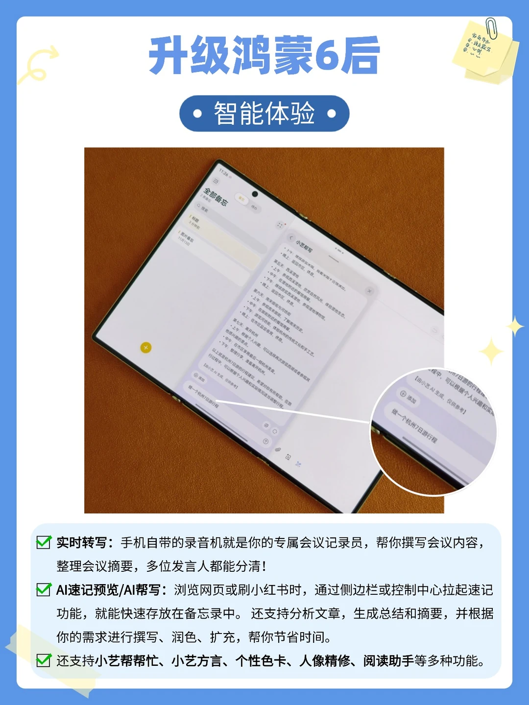 这款手机支持升级到鸿蒙6,直接解锁N种好用玩法。可以实时转写录音、总结文章摘要、撰写润色文案等等。