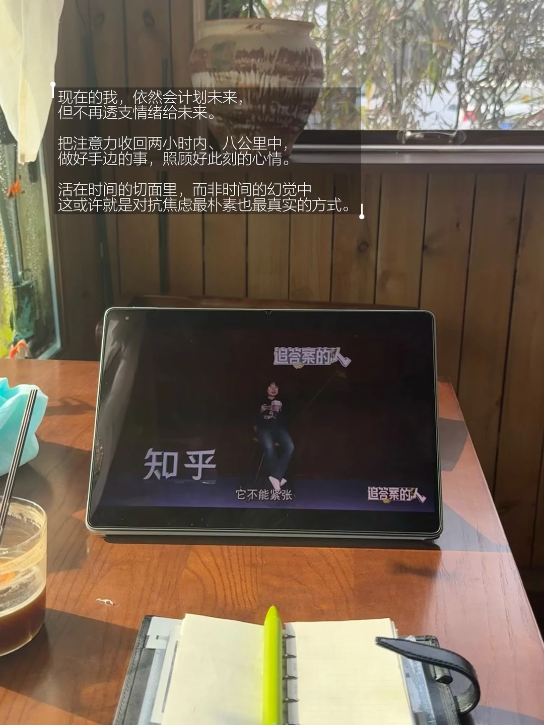 现在的我,依然会计划未来,但不再透支情绪给未来。把注意力收回两小时内、八公里中,做好手边的事,照顾好此刻的心情。活在时间的切面里,而非时间的幻觉中——这或许就是对抗焦虑最朴素也最真实的方式。