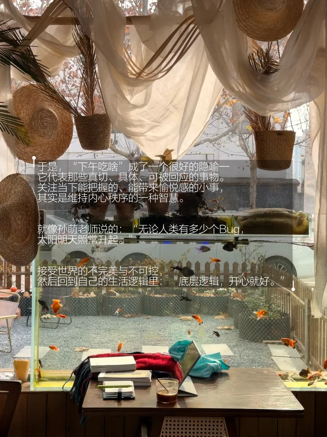 于是,“下午吃啥”成了一个很好的隐喻——它代表那些真切、具体、可被回应的事物。关注当下能把握的、能带来愉悦感的小事,其实是维持内心秩序的一种智慧。就像孙萌老师说的:“无论人类有多少个Bug,太阳明天照常升起。”接受世界的不完美与不可控,然后回到自己的生活逻辑里:“底层逻辑,开心就好。”