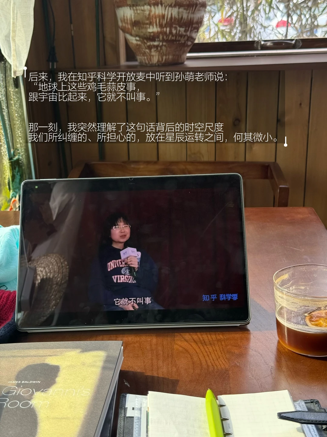 后来,我在知乎科学开放麦中听到孙萌老师说:“地球上这些鸡毛蒜皮事,跟宇宙比起来,它就不叫事。”那一刻,我突然理解了这句话背后的时空尺度——我们所纠缠的、所担心的,放在星辰运转之间,何其微小。