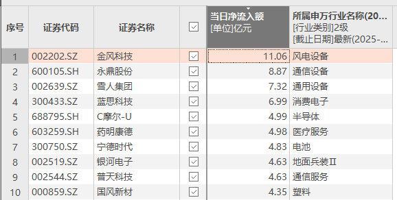 上证报中国证券网讯(记者徐蔚)Choice数据显示,12月11日,资金净流入额排名前十的个股依次是金风科技、永鼎股份、雪人集团、蓝思科技、C摩尔-U、药明康德、宁德时代、银河电子、普天科技、国风新材。其中,金风科技当日资金净流入额为11.06亿元。