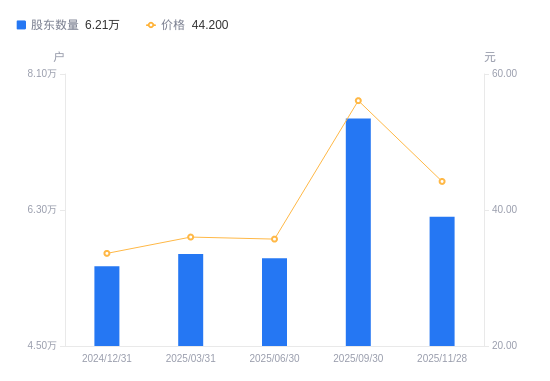 日期A股户数(户)流通A股户均持股数(股)户均持股市值(万元)2025-11-28621034387.8219.392025-09-30751233611.6920.252025-06-30566164792.3017.122025-03-31571764745.3617.092024-12-31555544883.9116.422024-09-30601214534.4015.282024-06-30560454864.1812.792024-03-31524895193.7212.392023-12-31540335045.3014.152023-09-30537325073.5714.96