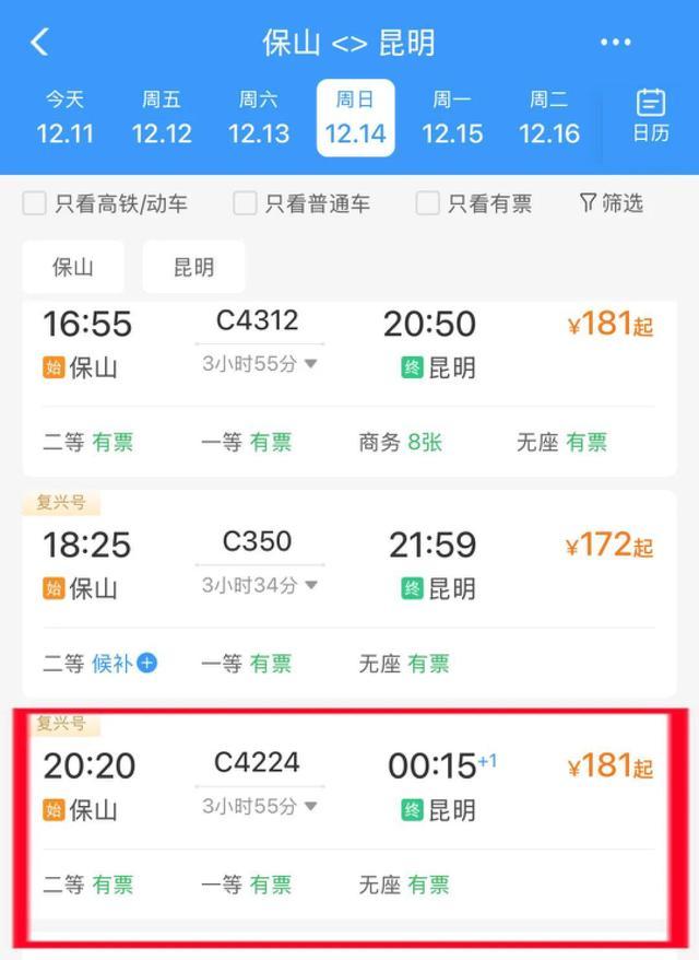 12月14日赛后增开C4224次保山→昆明列车,看完比赛轻松返程。