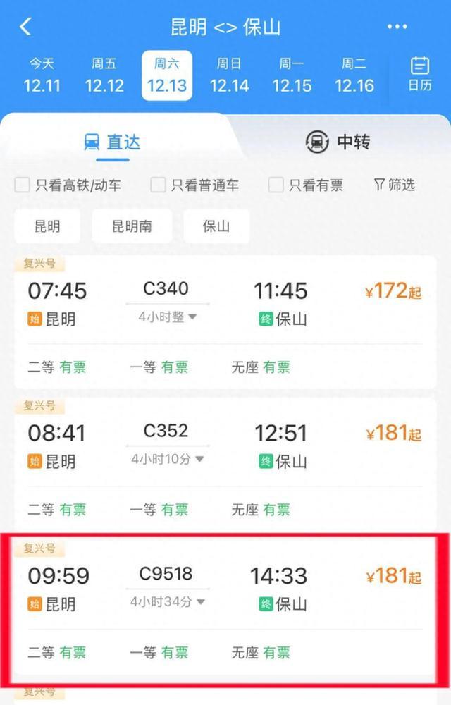 12月13日增开C9518次昆明→保山列车,赛前送你直达赛场。
