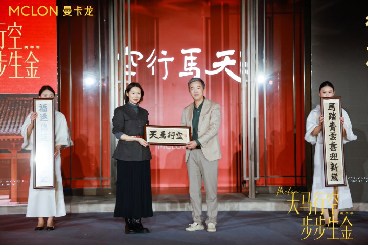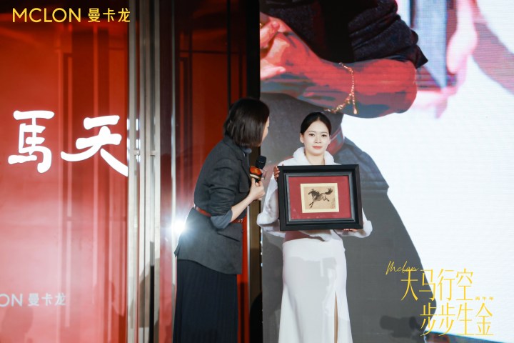 作为本次发布会上的重头戏,徐悲鸿美术馆馆长杨净携《奔马(得势)》真迹及徐悲鸿书法作品《天马行空》亮相,杨净不仅分享了作品的创作背景与艺术价值,还代表徐庆平先生将“天马行空-马年春联”手书捐赠给曼卡龙,见证了三方的深厚情谊。