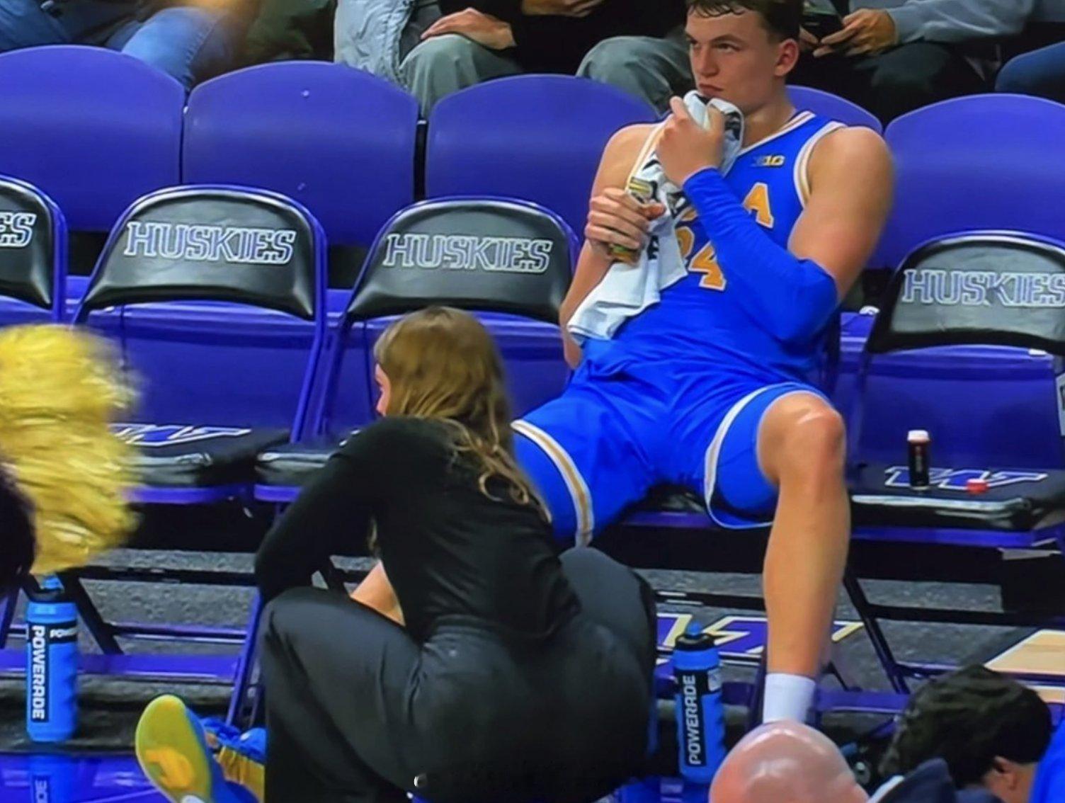 UCLA训练师Alexa Blatt因为在场边为一名受伤球员处理伤情被转播镜头拍