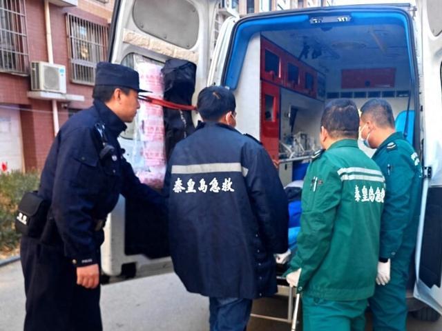 12月3日,洋河口海防派出所民警与医护人员配合将突发疾病老人抬上救护车送往医院。