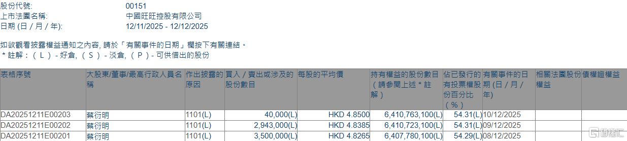格隆汇12月12日丨根据联交所最新权益披露资料显示,2025年12月8日-12月10日,中国旺旺(00151.HK)获执行董事蔡衍明在场内以每股均价4.8265-4.85港元合计增持648.3万股,涉资约3132.6万港元。