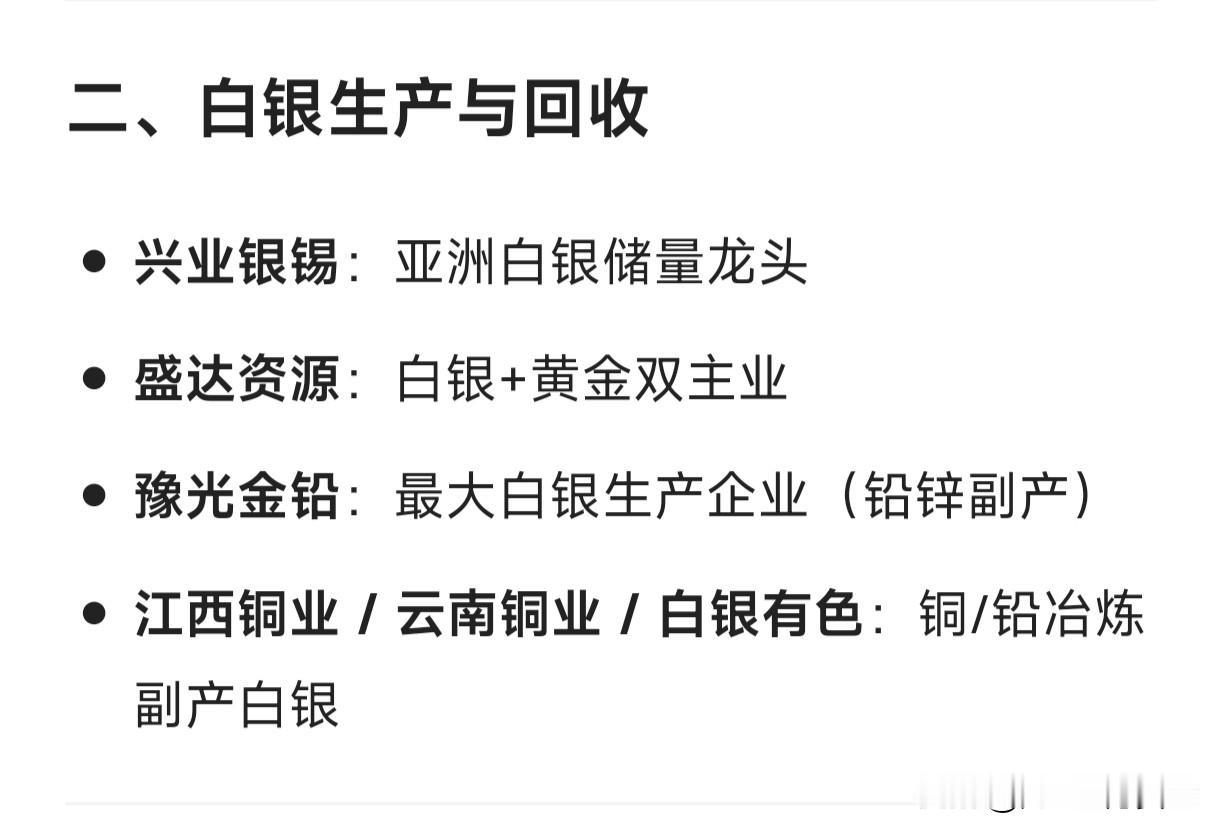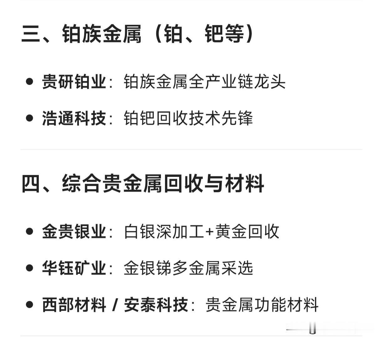 贵金属关联概念企业龙头汇总: 一、黄金开采与冶炼 紫金矿业:黄金+铜资源龙头 山东黄金:纯黄金采选冶龙头 中金黄金:央企黄金全产业链 赤峰黄金:海外金矿布局领先 湖南黄金:黄金+锑双资源 西部黄金:新疆区域黄金龙头 银泰黄金:高品位金矿企业 恒邦股份:黄金冶炼与综合回收   二、白银生产与回收 兴业银锡:亚洲白银储量龙头 盛达资源:白银+黄金双主业 豫光金铅:最大白银生产企业(铅锌副产) 江西铜业 / 云南铜业 / 白银有色:铜/铅冶炼副产白银   三、铂族金属(铂、钯等) 贵研铂业:铂族金属全产业链龙头 浩通科技:铂钯回收技术先锋   四、综合贵金属回收与材料 金贵银业:白银深加工+黄金回收 华钰矿业:金银锑多金属采选 西部材料 / 安泰科技:贵金属功能材料