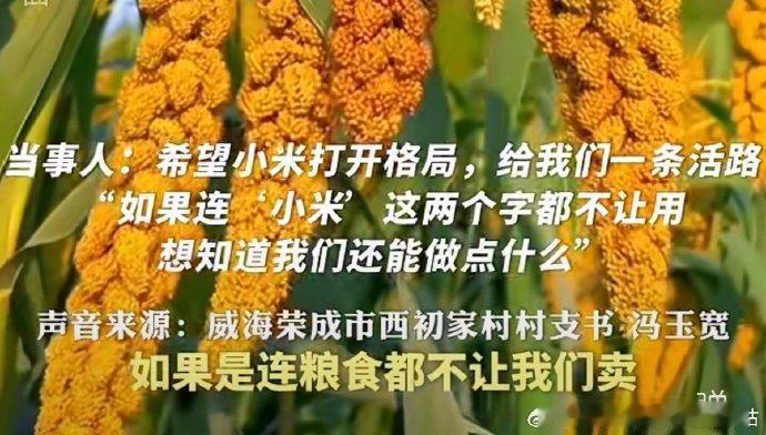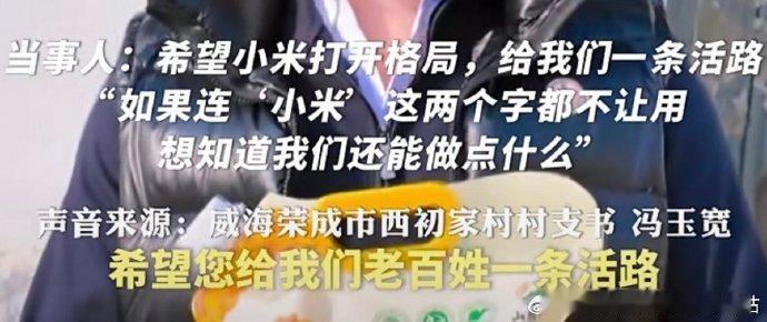 【炸裂】小米法务“追杀”农民?村支书卖真小米被投诉下架,网友怒喊:雷总,把格局打开! 12月10日,山东威海荣成西初家村,村支书冯玉宽为帮村民卖掉滞销的谷物小米,拍短视频时模仿雷军经典语调:“小米新品上线!保障交付!”结果视频刚火,就被小米法务 以“丑化高管形象”为由投诉下架。冯支书红着眼鞠躬:“祖祖辈辈种的小米,难道连名字都不能叫了?如果连‘小米’两个字都不让用,我们还能做点什么?”