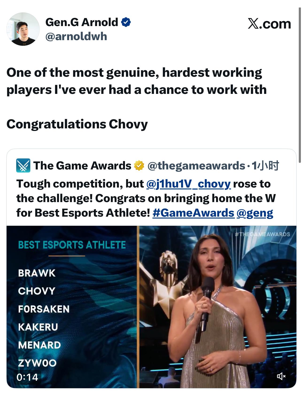 虎扑12月12日讯GENCEO转发Chovy获得TGA年度最佳电竞选手推文并配文:
