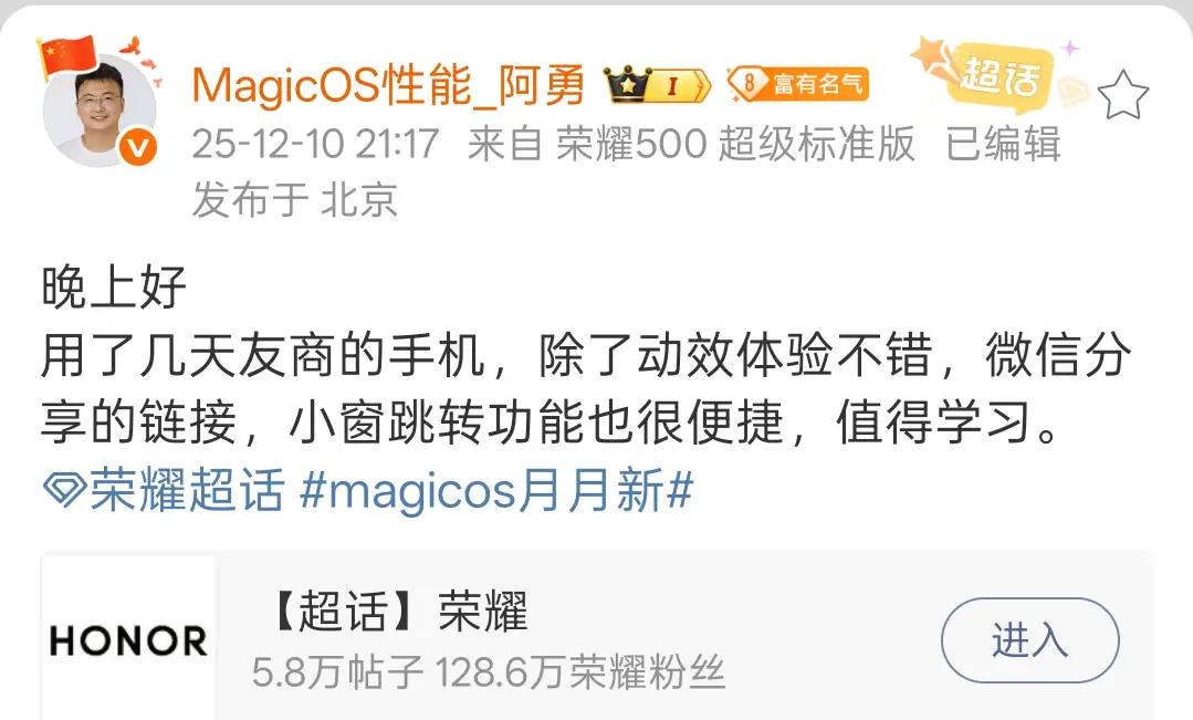 荣耀工程师这波操作,我直接竖大拇指! 刷到荣耀工程师被拍到用友商手机,还以为是“叛变”了,结果真相超圈粉! 人家根本不是乱玩,是实打实上手体验竞品系统,直接对比找MagicOS的优化点——这哪里是摸鱼,分明是光明正大“取经”啊! 别家厂商私下对比很常见,但荣耀敢大方公开、坦然认差距的态度,真的太难得!这种直面不足、虚心学习的劲儿,格局直接拉满~ 有这样的团队盯着优化,MagicOS的未来能不期待吗?