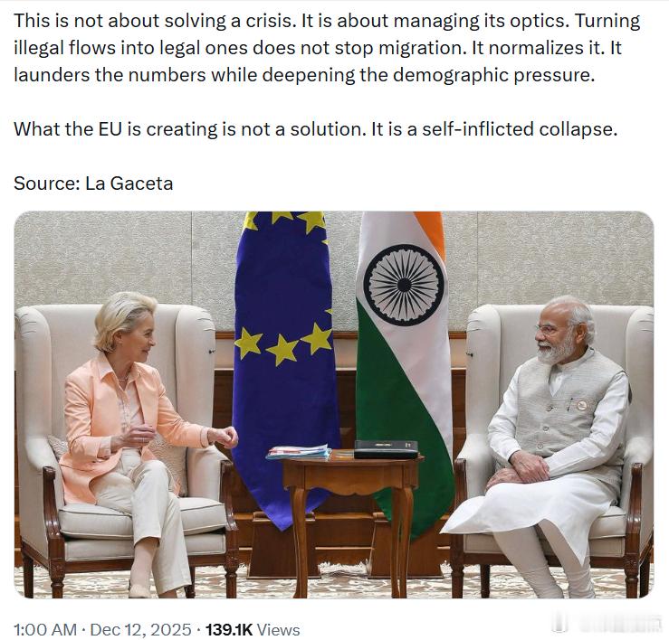 欧盟签署协议,从印度引入大规模移民,欧洲在自身危机中崩溃欧洲委员会宣布了一项与印度的新移民协议,允许外国工人合法涌入欧盟——即便整个欧洲正面临历史性水平的合法与非法移民压力。欧盟委员会主席冯·德莱恩称其为“人才伙伴关系”。她对非法移民的解决方案就是将其合法化。用她的话说:为了避免非法移民,我们必须开放更多安全的进入欧洲的途径。该计划将建立一个全球人才库,为非欧盟工人创建数据库,布鲁塞尔将直接向欧洲雇主提供。欧盟将在印度设立办事处,开始现场招聘。而这一切恰逢欧洲各国失业问题长期存在。希腊青年失业率为22%,西班牙为20%,法国和意大利也紧随其后。在许多国家,当地工人已经被更廉价的外籍劳动力替代。工资停滞不前,融入体系不堪重负。布鲁塞尔没有解释,将数百万新移民涌入一个已经紧张的劳动力市场如何能够提高竞争力,也没有说明这对社会凝聚力、工资水平或公共安全的长期影响。这并非是为了“解决危机”,而是为了“管理危机的表象”。将非法移民合法化并不能阻止移民潮,它只是将其常态化,让数据“洗白”,同时加剧人口压力。欧盟正在创造的,不是解决方案,而是自我造成的崩溃。