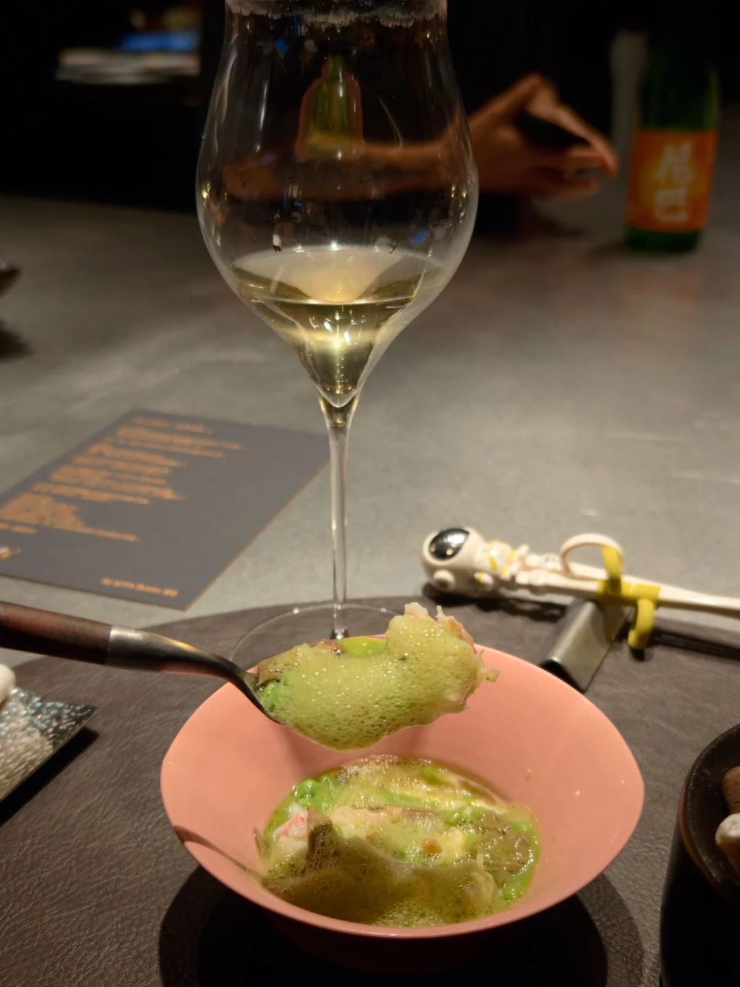 🦀莼菜松叶蟹茶碗蒸像嫩滑豆花,豆香浓郁,搭配“好好喝干白”堪称绝配;