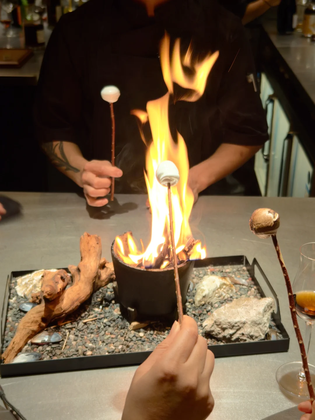 🦆湖州白羽鸭的鸭皮焦香如焦糖搭配怪味酱,值得回味,果然名不虚传,澳洲平铁牛排蘸辣皮子酱,这组合绝啦。🍬 燃烧棉花糖DIY超有仪式感,氛围直接拉满~