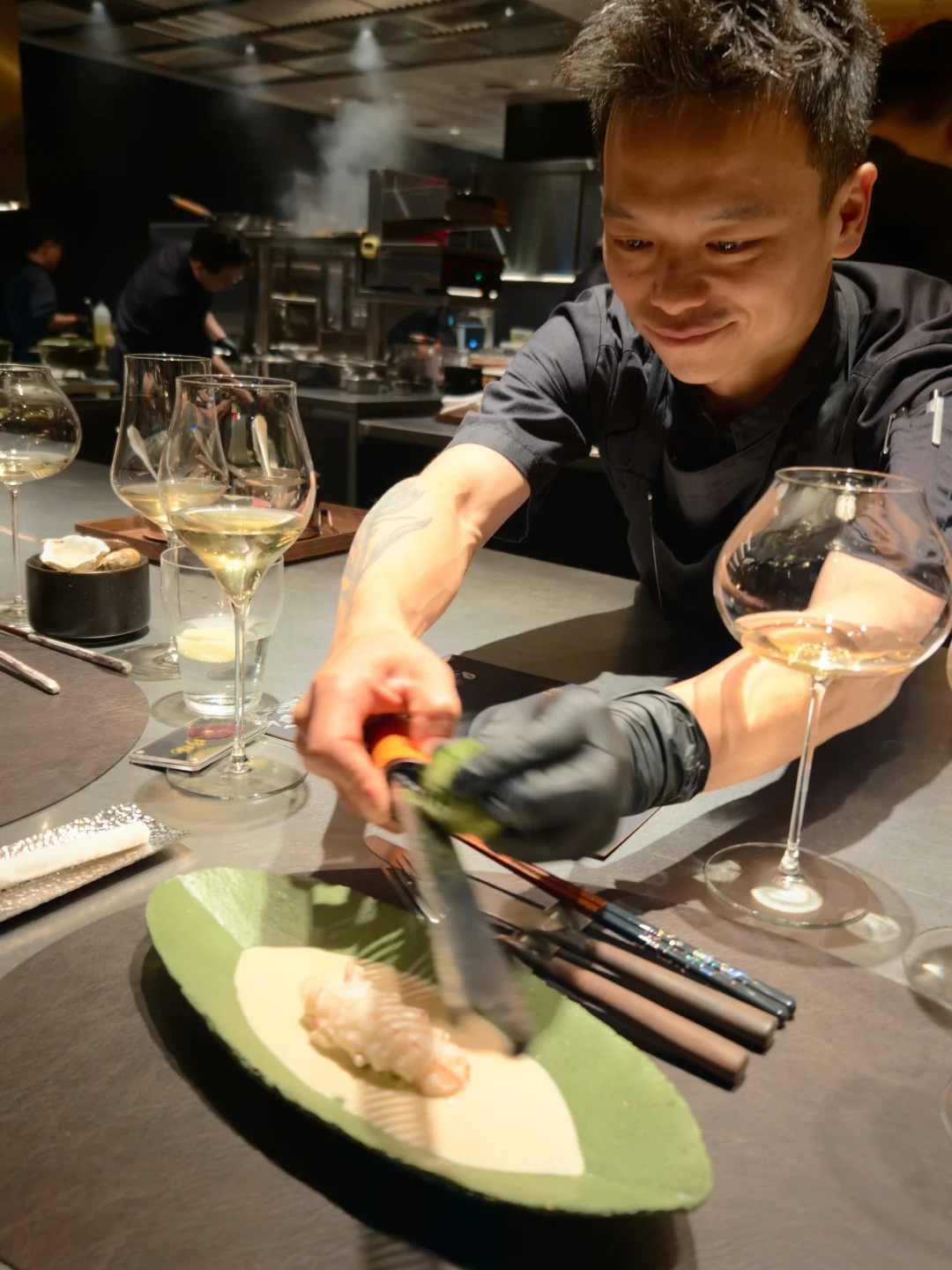 坐在板前,可近距离观赏火候变化、摆盘过程,
