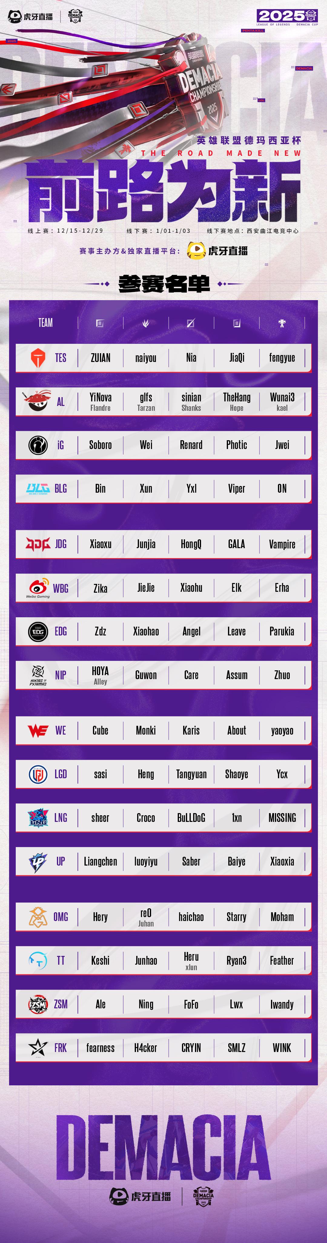 虎扑12月12日讯今日官方发布德玛西亚杯各战队出征名单,具体如下: