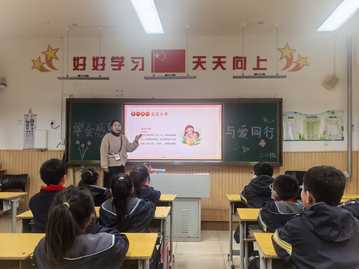 活动中,中队辅导员老师通过生动的短视频,带领同学们回顾父母的日常陪伴、老师的耐心教导、同学的互助瞬间,一个个贴近生活的画面引发同学们强烈共鸣。