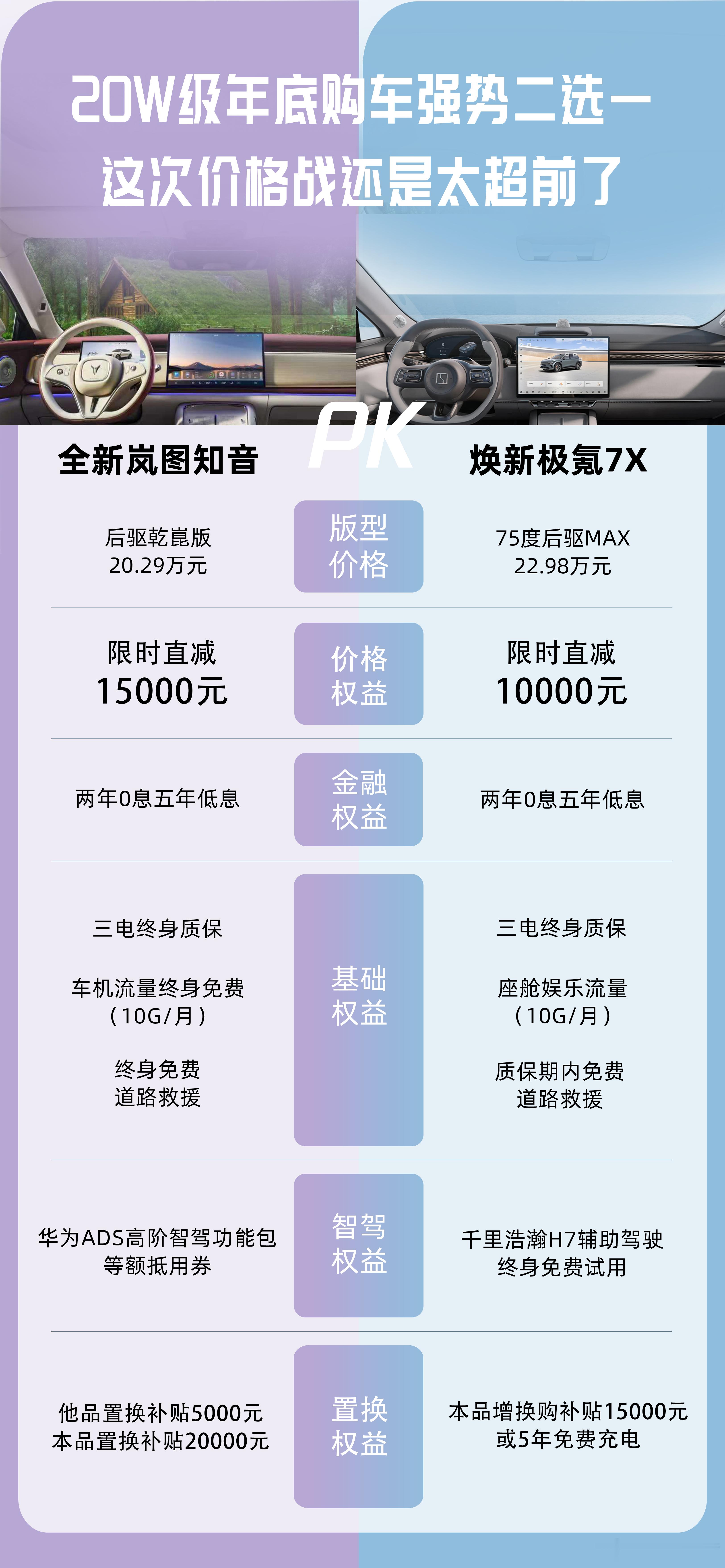 岚图这次卷的真是价格吗?全新岚图知音起手20.29万、12月限时直减1.5万,看似价格战,实则“权益战”:三电终身质保、终身免费车机流量、终身道路救援,岚图这波是走的长期主义,让用户从买车到养车一路无忧。本品置换补贴2万,更是盯紧了升级刚需。岚图可谓是卷全程体验的高手!岚图知音 20w级华系SUV 年底购车 购置税减免
