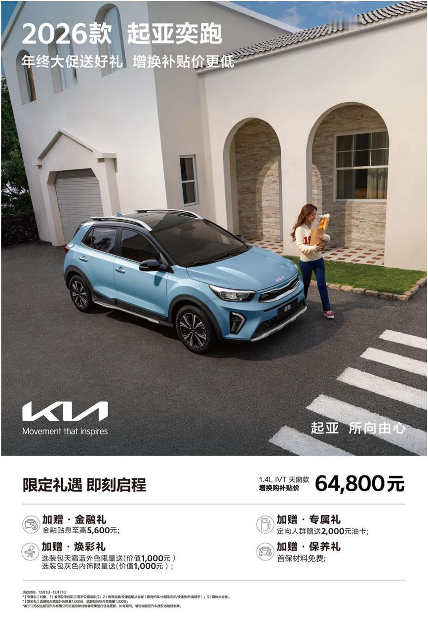 细节里的“偏爱”:2026款起亚奕跑,懂车更懂你 一台真正贴心的座驾往往胜在细节,2026款起亚奕跑在配置层面,展现出了对年轻用户,尤其是女性车主的“偏爱”。它用新增的“天霜蓝”外观和灰色内饰等时尚配色,首先满足了视觉上的精致感,而这份贴心,更深入到了用车体验的方方面面: 2026款起亚奕跑特意配备了带照明的驾驶席大型化妆镜,让你在通勤等红灯的间隙也能从容补妆,时刻保持精致状态。而针对雨雪天气或温差大的环境,外后视镜加热功能则显得尤为实用,一键清除水雾,保证视野清晰。周末出游时,打开电动天窗,阳光洒满车内,让路途充满惬意。 这份精致生活的入场券,现在触手可得,全新上市的1.4L IVT天窗款,增换购补贴后仅需64,800元,还可享受最高5600元金融贴息、首保材料免费等权益,让你的用车生活不仅精致,更加省心无忧。
