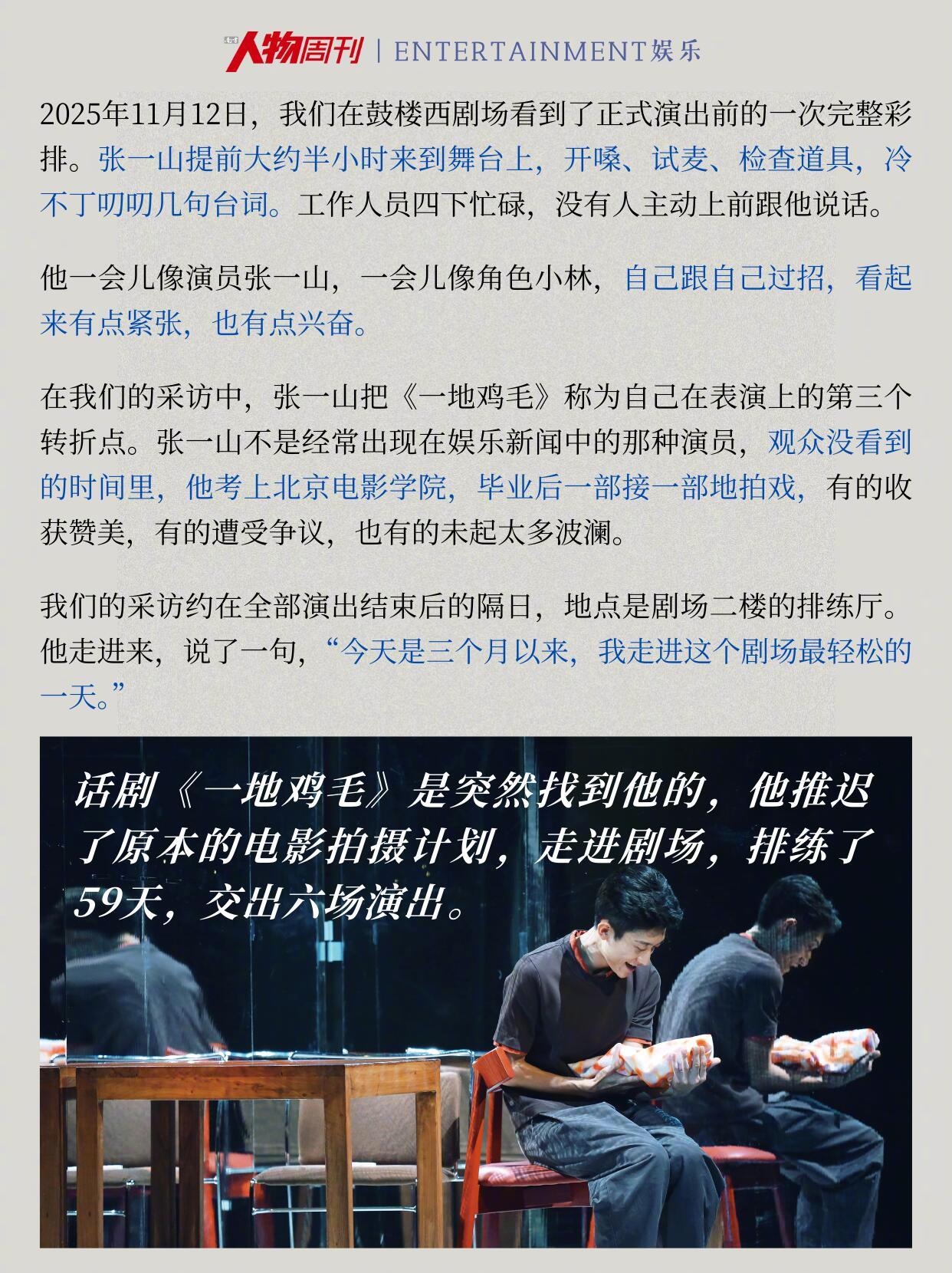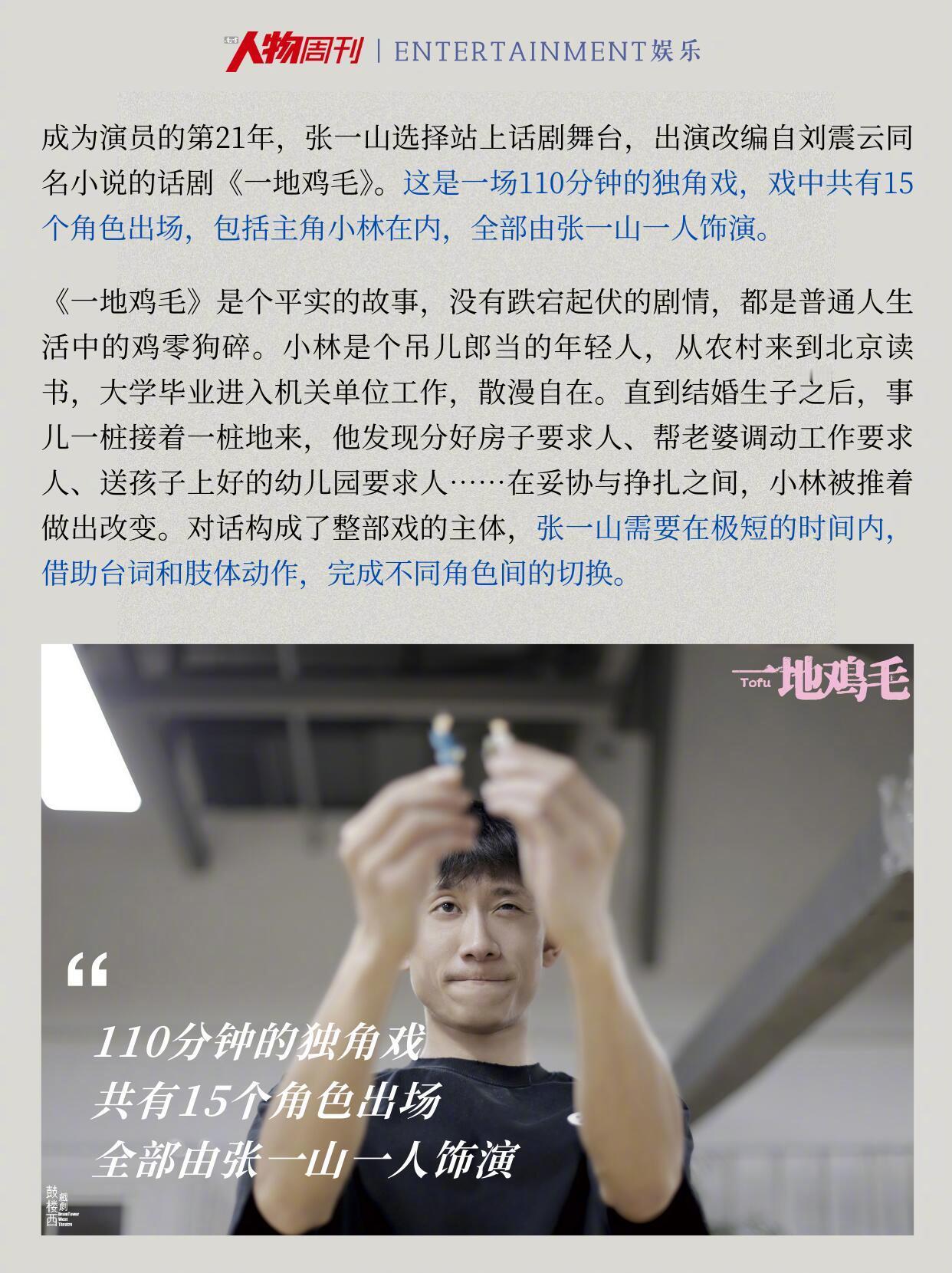 张一山首度挑战话剧舞台,在改编自刘震云小说的《一地鸡毛》中,完成了一场110分钟的独角戏。他一人演绎包括主角小林在内的15个角色,为此投入59天排练,最终呈现六场演出。全部演出结束后的第二天,他说:“今天是三个月以来,我走进这个剧场最轻松的一天。”