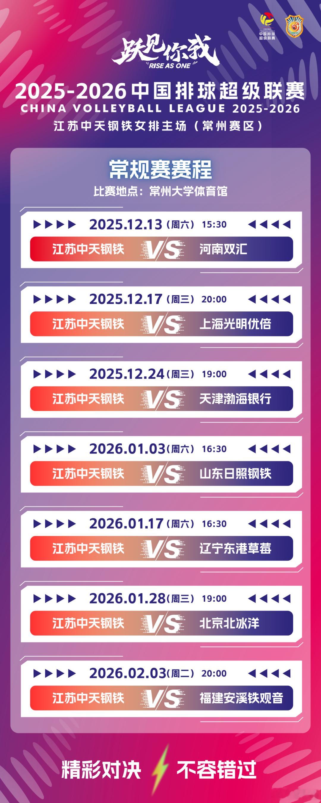 排超联赛江苏中天钢铁女排【常州】2025-2026中国排球超级联赛江苏中天钢铁女子排球俱乐部主场赛事(常州赛区)💡 门票价格单日单场赛事门票VIP票 258元/人甲等票 149元/人乙等票 99元/人丙等票 79元/人常规赛套票同步发售,优惠多多VIP套票 1088元/人甲等票套票 688元/人乙等票套票 388元/人丙等票套票 288元/人 🔥首战对阵:江苏中天钢铁🆚河南双汇📅首战日期:2025年12月13日(周六)🗺️比赛地点:常州大学(科教城校区)体育馆
