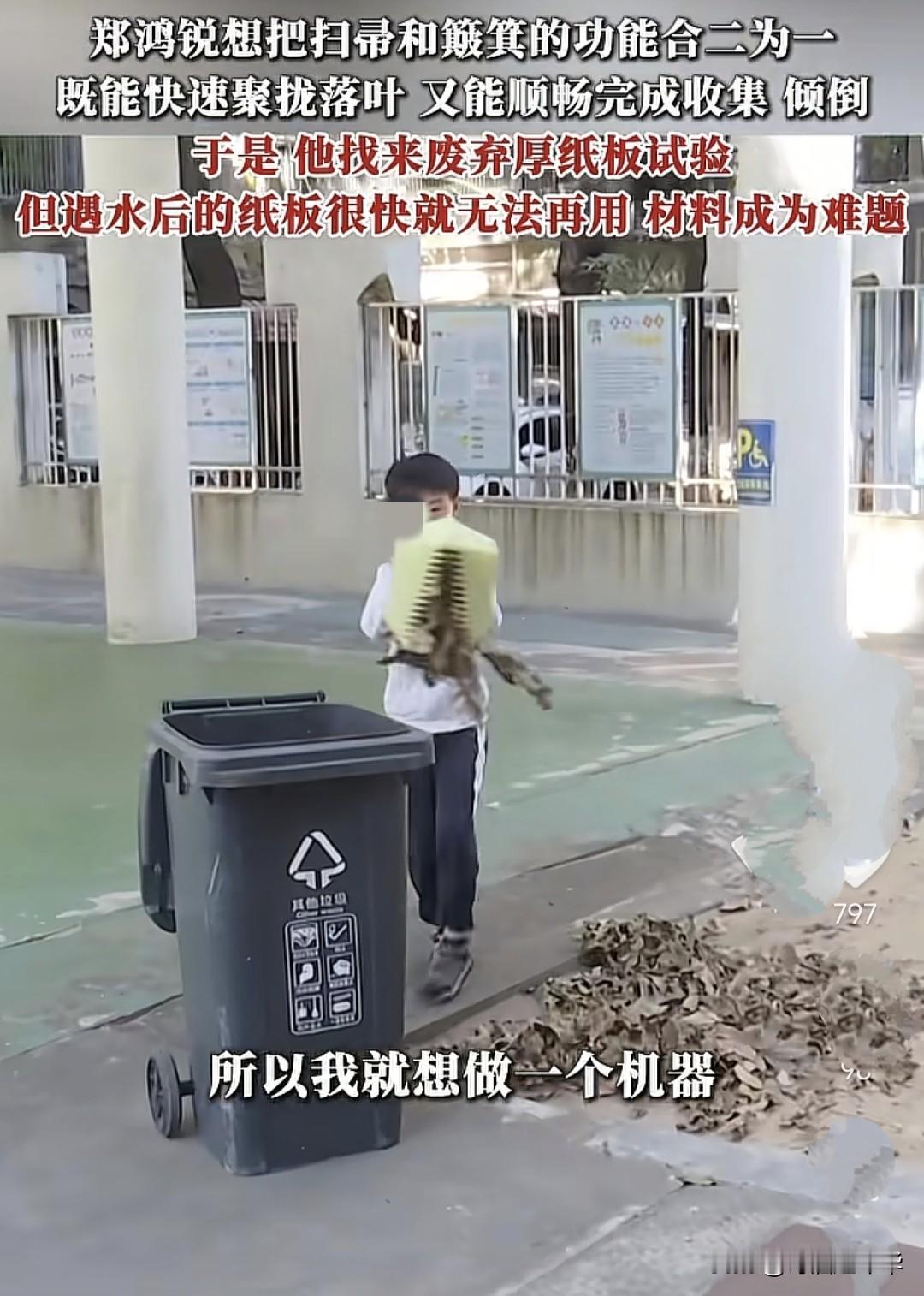 小学生在父亲的帮助启发下发明了“落叶清扫神器”,获得国家发明专利,但凡家里有一位有劳动常识的人,也不会想着拿这个去扫树叶,图三是环卫工大爷自己的发明,这个方法用了几辈子了,简便高效实用,也没想着去申请专利。