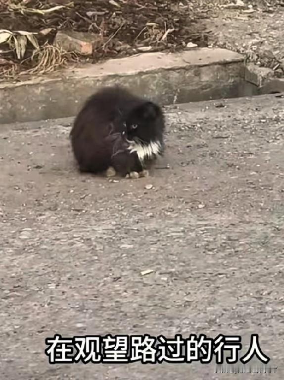 菜市场路口,一只小黑猫蹲在路边等候主人。它左顾右盼,饥肠辘辘的它只能四处寻觅食物