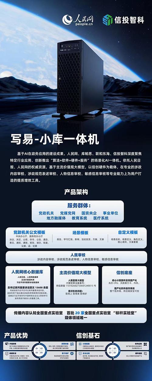 总而言之,“人民网信投智科智能体(一体机)”是人民网智能体的创新实践,依托人民网、库帕思、联和东海、信投智科深度聚焦特定行业应用,基于人民智媒大模型,以信创硬件为载体,提供专业的涉政内容审核、涉政规范表述审核、人物信息审核、敏感信息审核等专业能力,为用户打造提质增效的智能工具。